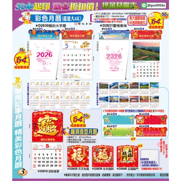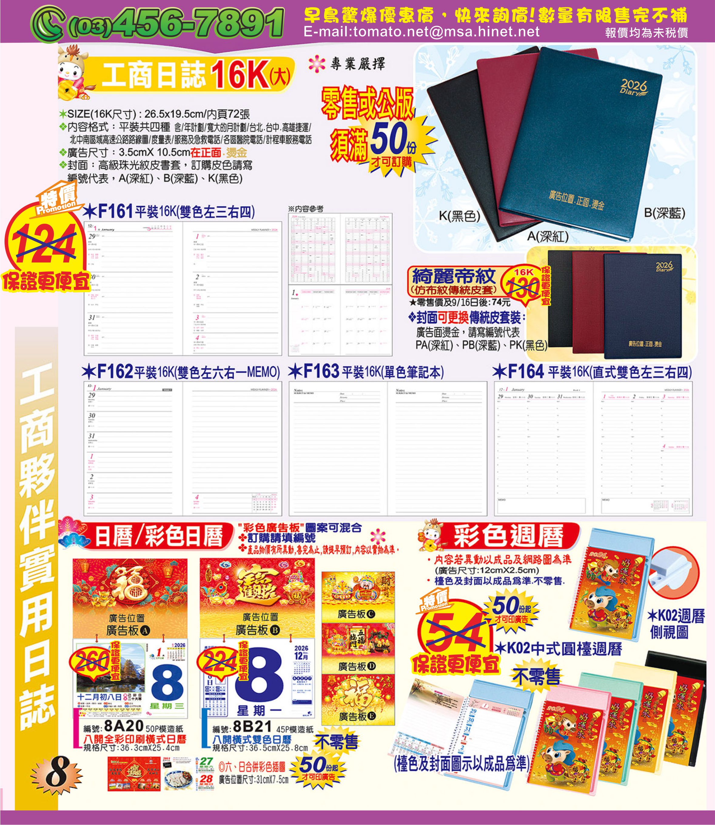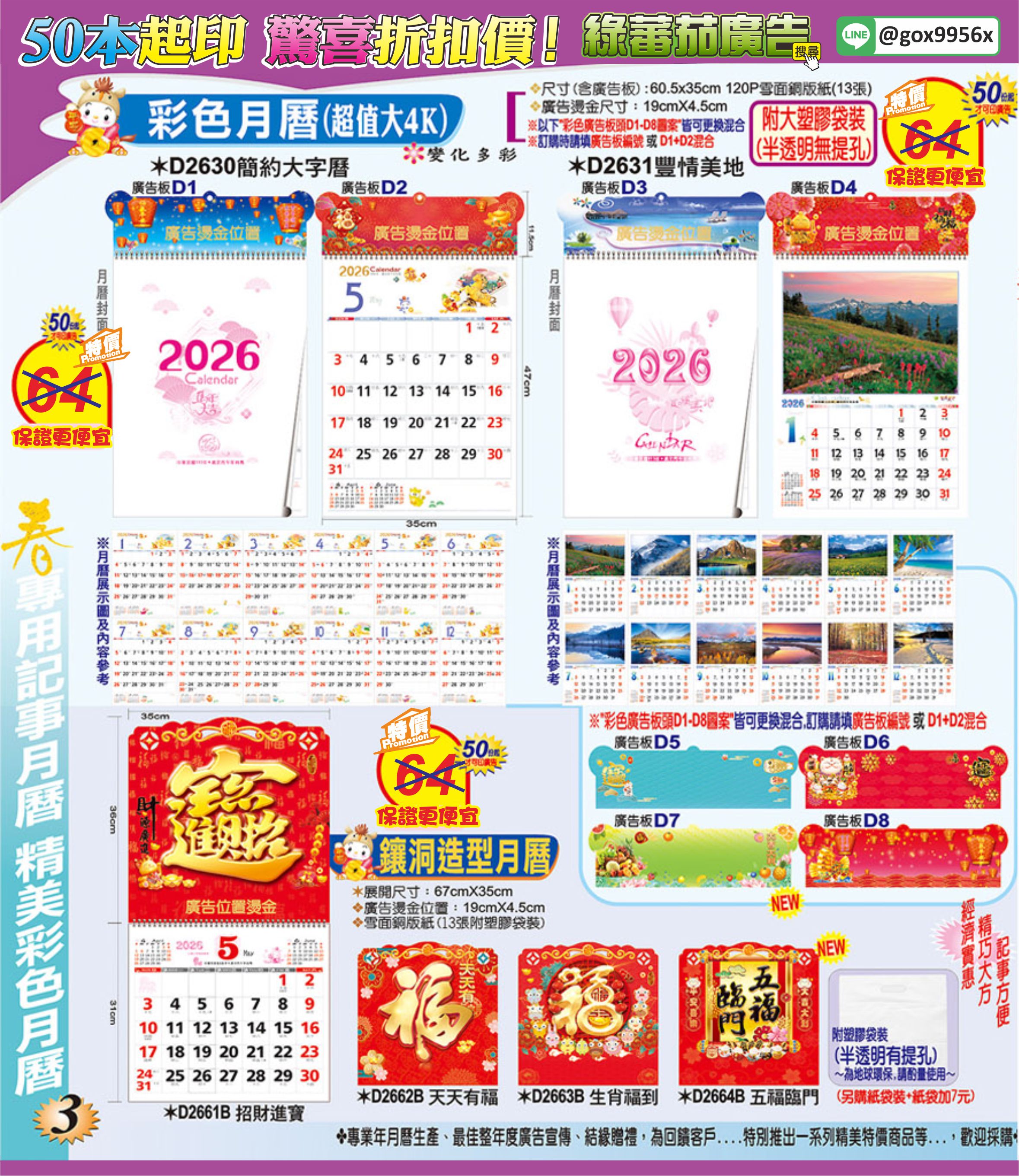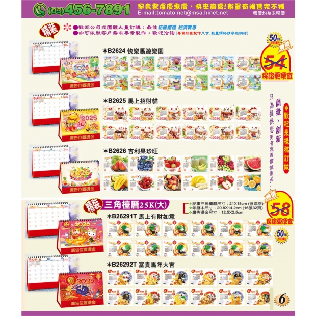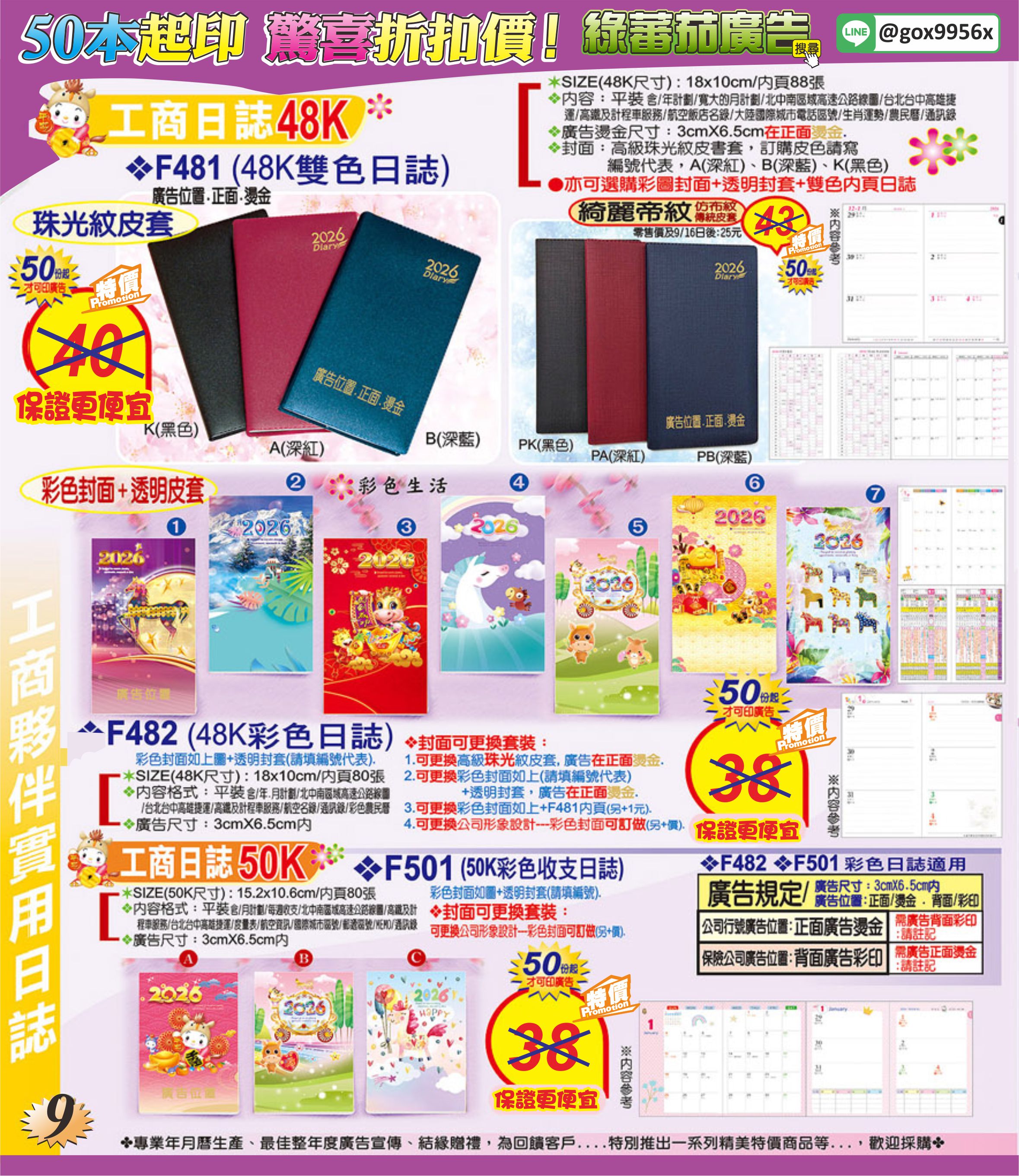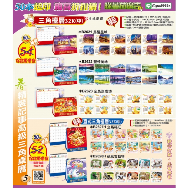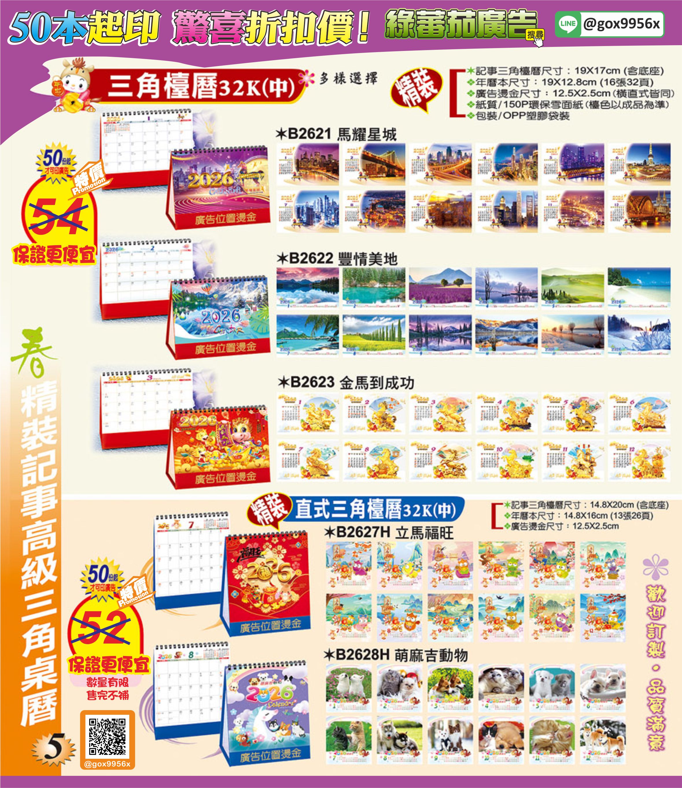 提供多種款式:三角桌曆、工商日誌、掛曆、筆記型等
